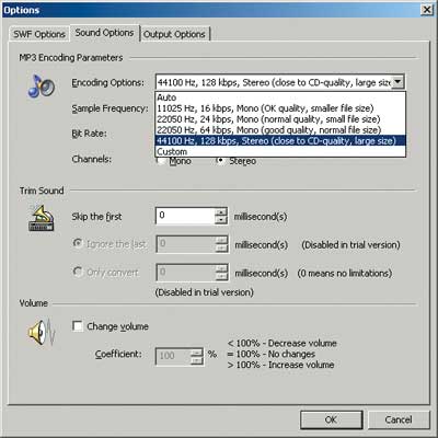 Selanjutnya, dari tombol “Options” Anda bisa memilih jenis encoding. Aktifkan tab “Sound Options” dan pada bagian “Encoding Options”, pilih “44100 Hz, 128 kbps, Stereo” untuk menghasilkan output yang bagus.
